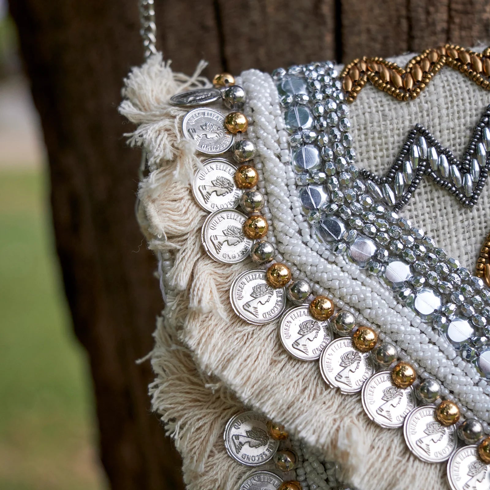 Where tradition meets trend. This boho-chic sling bag features intricate hand embroidery paired with a sleek metal chain strap. Lightweight yet eye-catching, it's perfect for adding a touch of artisanal charm to any outfit.