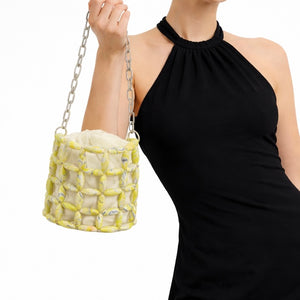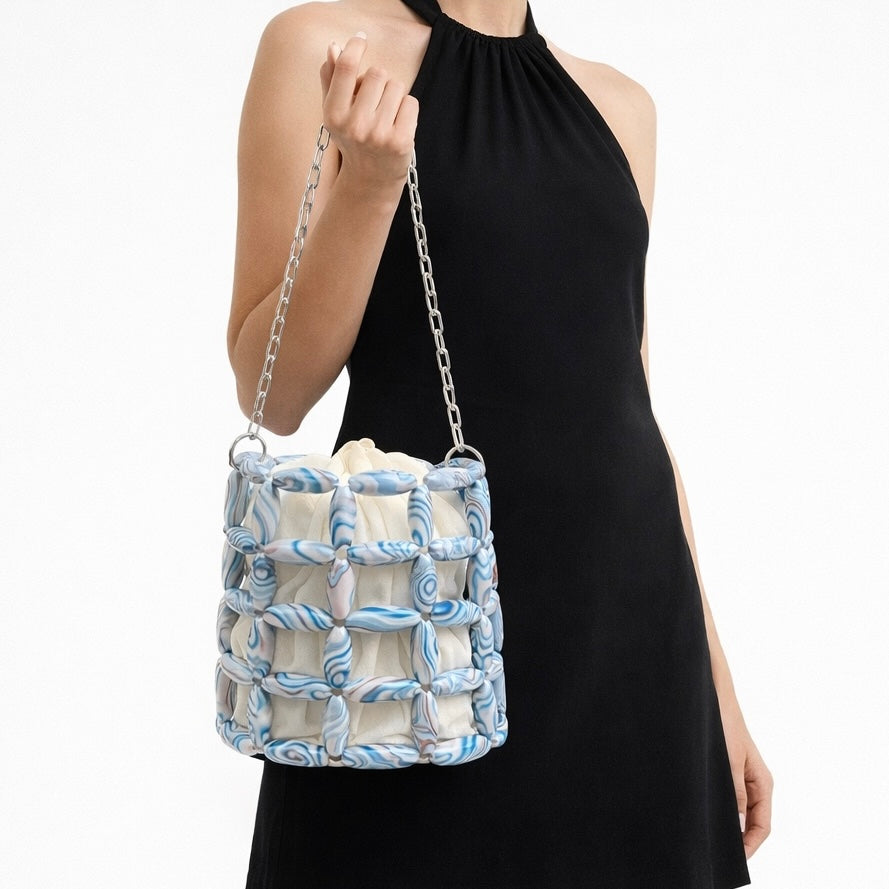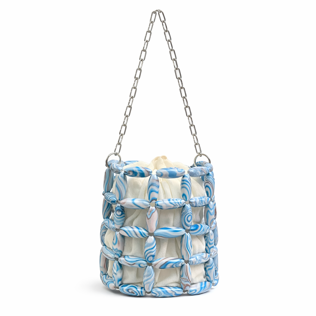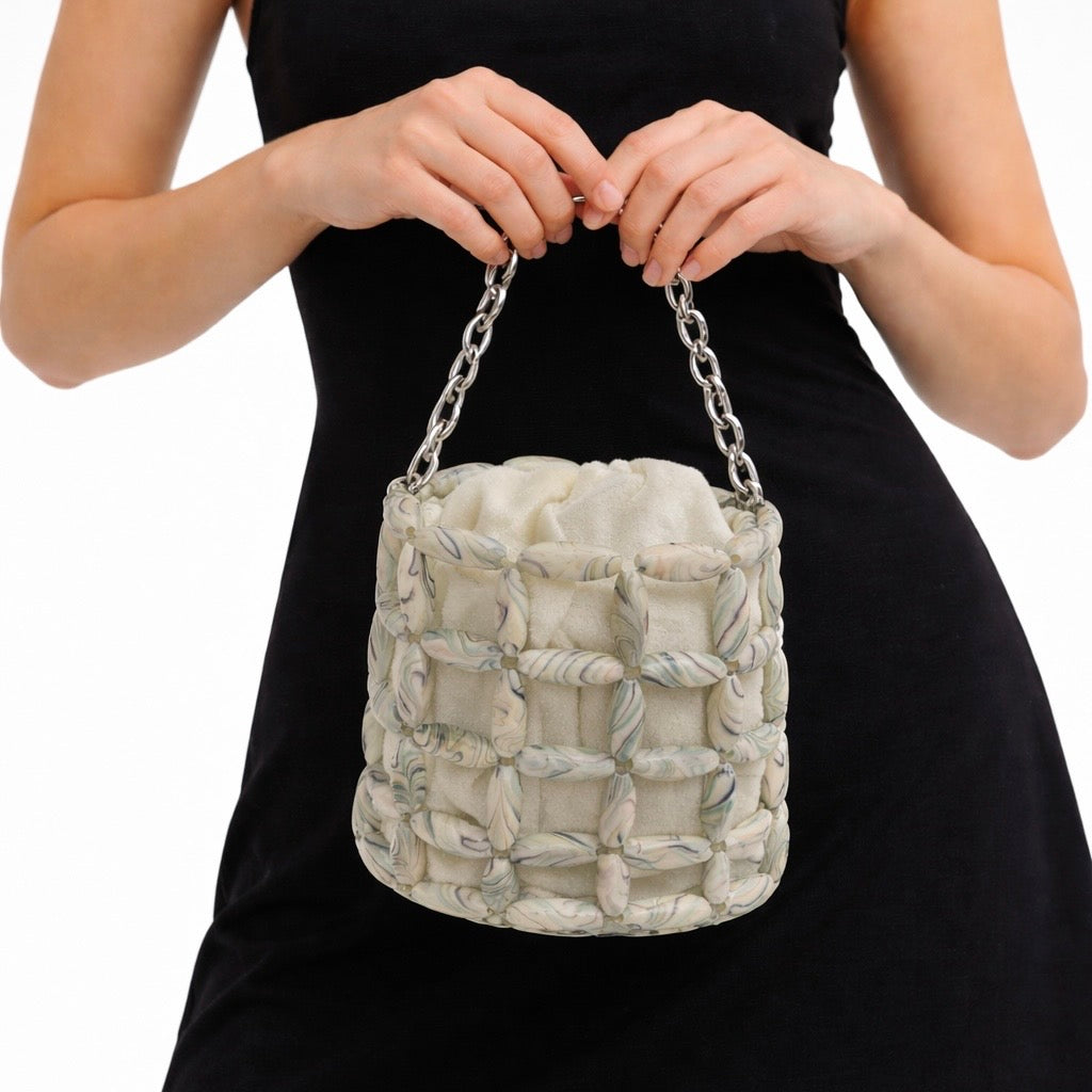 Turn heads with this sculptural mini bucket bag featuring a unique marbled lattice design and a soft inner pouch. The contrast of structured beads and fluid fabric creates a modern, artistic look—perfect for elevating both casual and occasion wear.