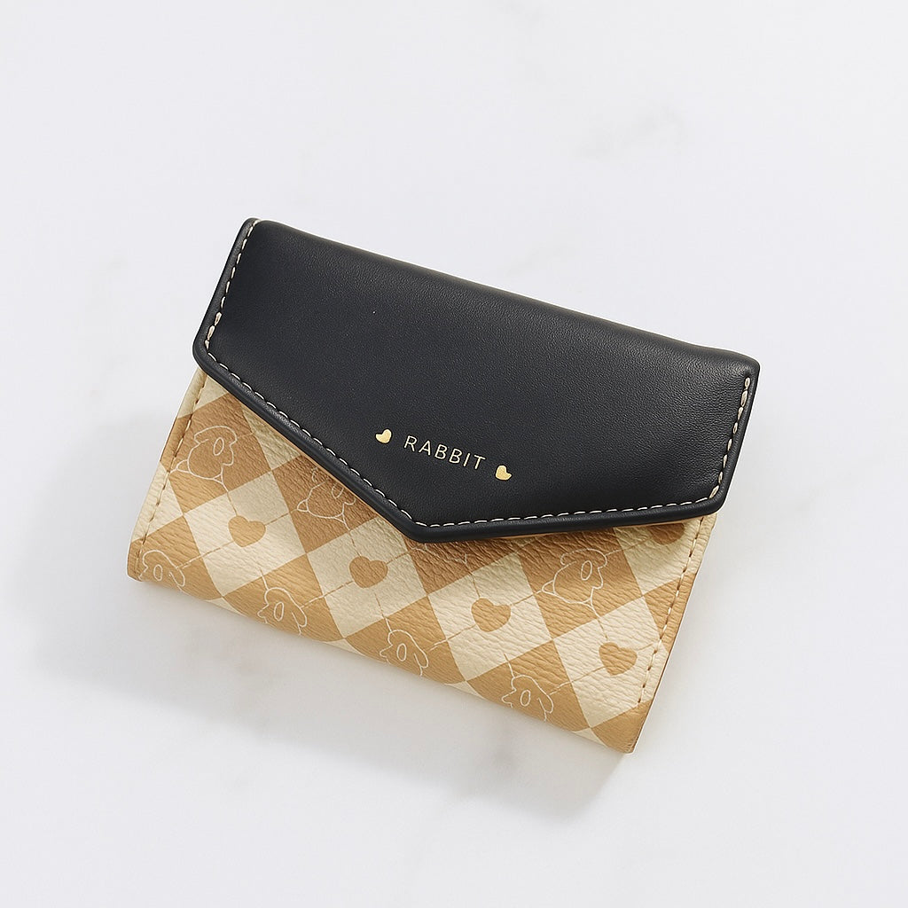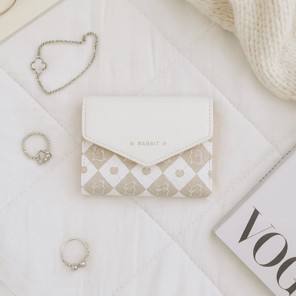 A compact and stylish 3-fold wallet designed with a playful rabbit and heart checkered pattern. Made with a smooth flap closure , it features gold detailing for a chic finish. Perfect for organizing cash, cards, and coins while keeping your everyday look cute yet elegant.