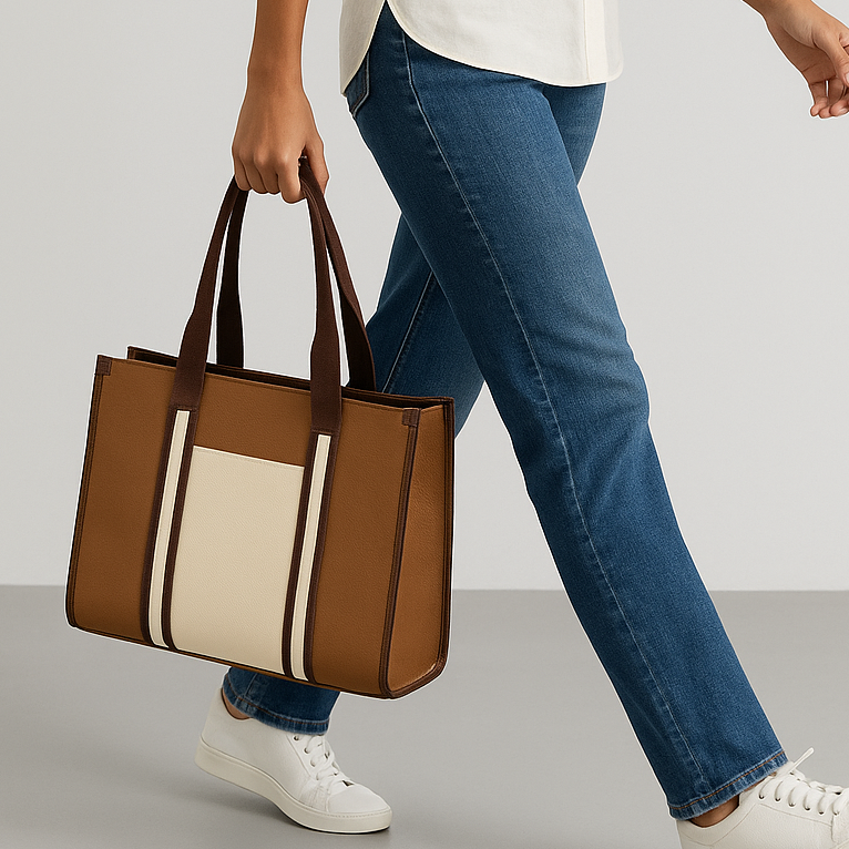 The Solara Tote is a timeless statement piece crafted for the modern woman. With its structured silhouette and luxurious two-tone design in rich caramel brown and ivory, it exudes effortless sophistication. The elongated dual handles ensure comfort, while the spacious interior makes it perfect for work, travel, or everyday chic styling.