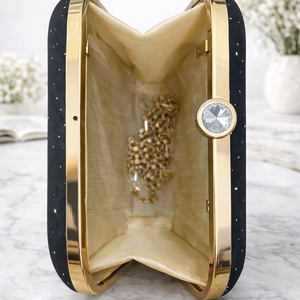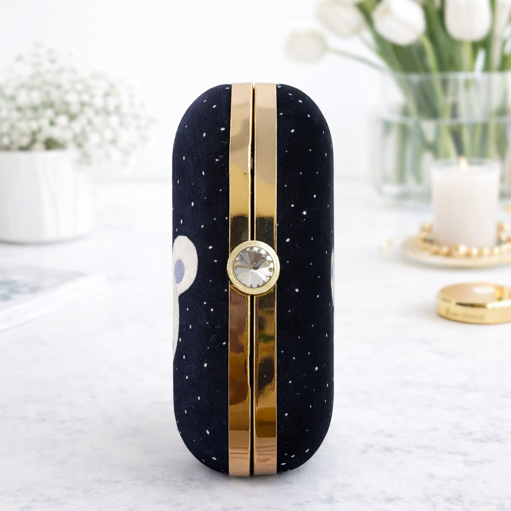 Make a statement with this vibrant box clutch featuring bold digital prints and a sleek metal sling chain. Compact yet striking, it’s perfect for hands-free style at parties and special events.
