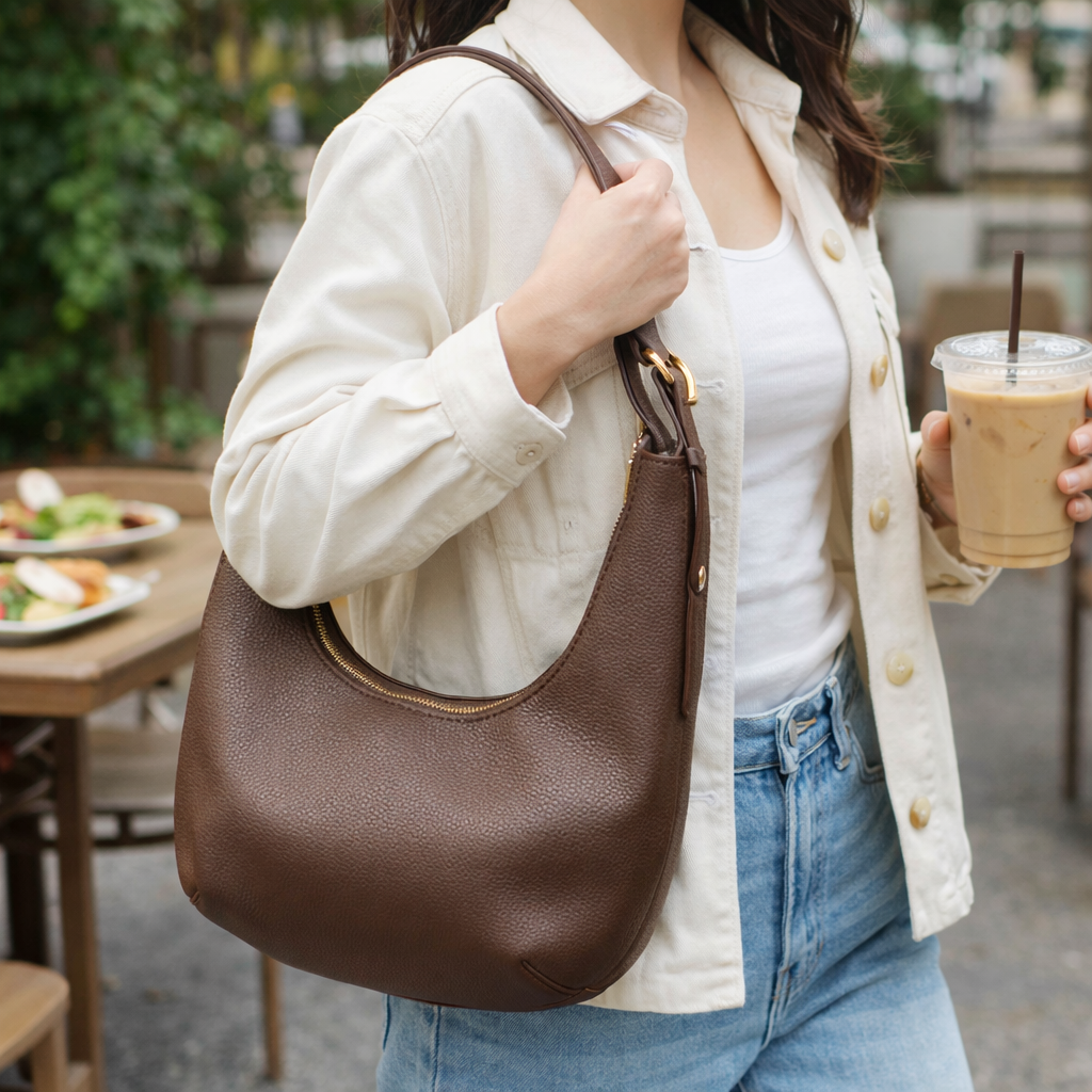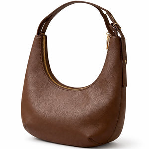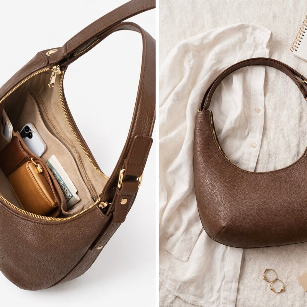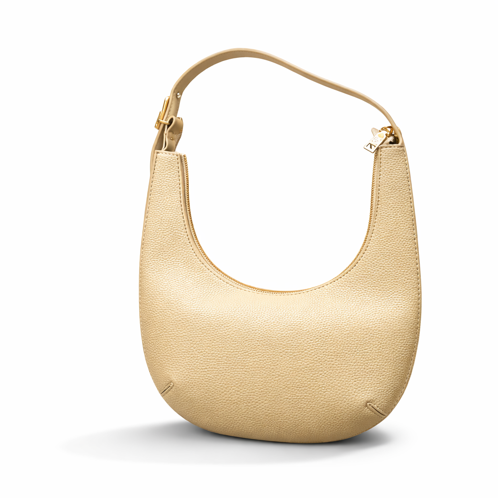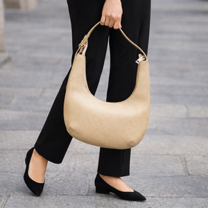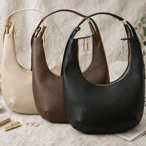 This crescent-shaped shoulder bag features a smooth, pebbled finish with a minimalist silhouette that drapes beautifully under the arm. Lightweight yet roomy with a secure zip closure, it’s the perfect everyday bag for polished, modern looks—from casual errands to city strolls. Your go-to-shoulder bag in classic tones designed for everyday ease — timeless, spacious, and effortlessly chic.