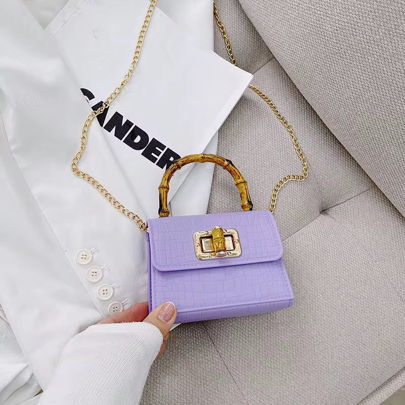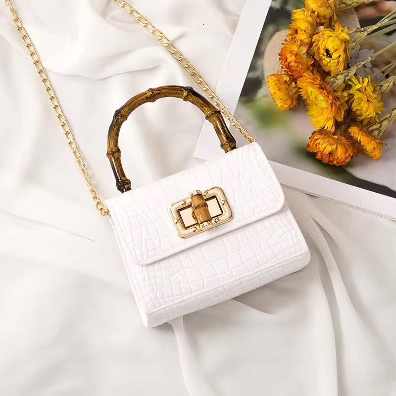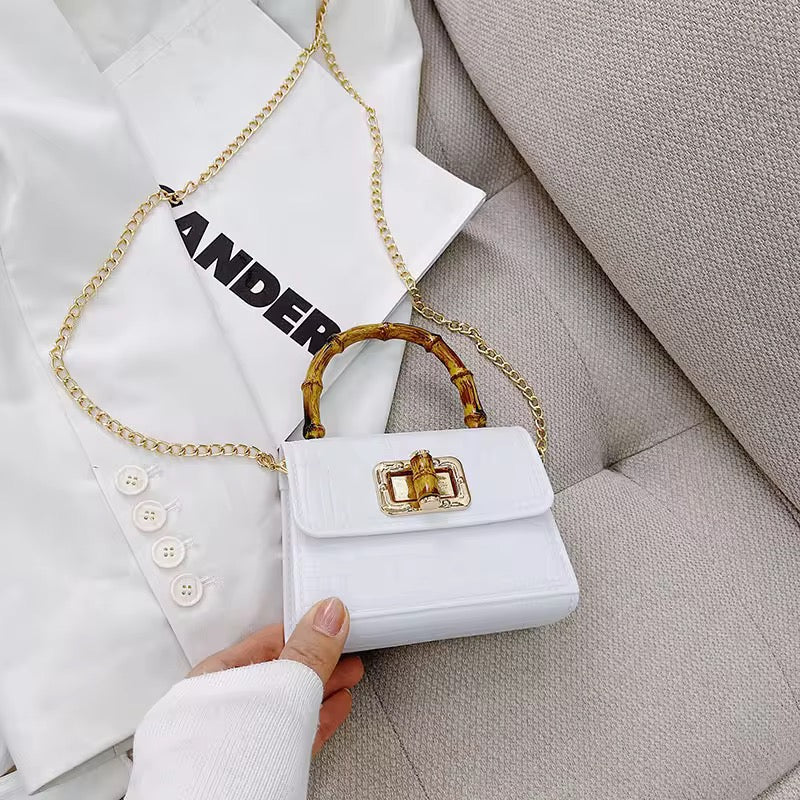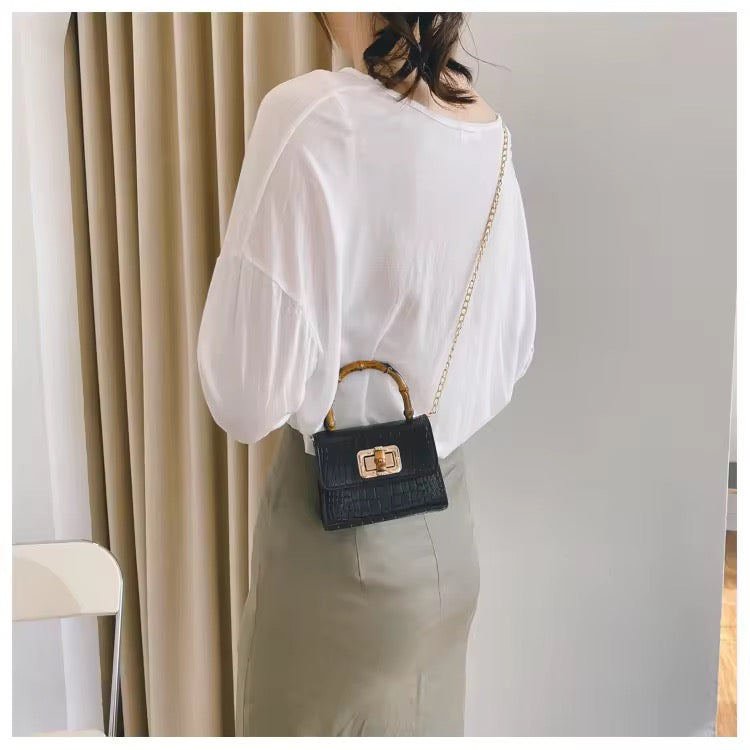 Turn heads with this statement-making mini bag, featuring a luxe bamboo-inspired handle and a chic crocodile-textured finish. Compact yet classy, it’s designed to carry your essentials in style—perfect for brunch dates, evening outings, or adding a pop of color to your everyday look. With its gold-tone chain strap and timeless silhouette, the Bamboo Mini Bag is your go-to blend of elegance and trend.