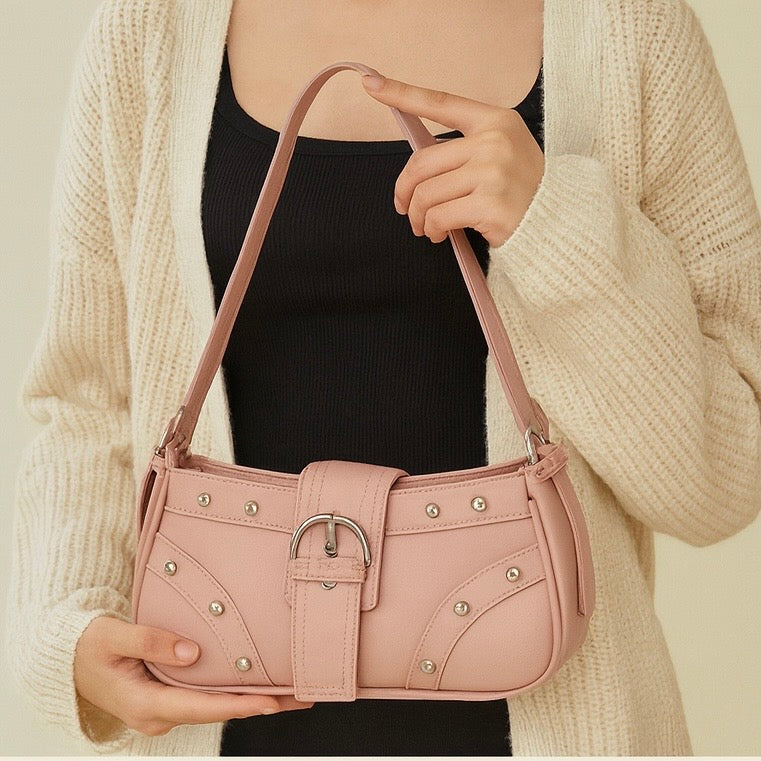 This is a compact shoulder bag with a bold, vintage-inspired design. Crafted from smooth, glossy faux leather, it features decorative metal studs, curved panel detailing, and a statement front buckle for added character. The adjustable shoulder strap allows comfortable wear, while the structured silhouette keeps essentials neatly in place. Stylish yet practical, it’s perfect for day-to-night looks with a touch of edgy elegance. Step into your main character era with the City Girl Baguette.
