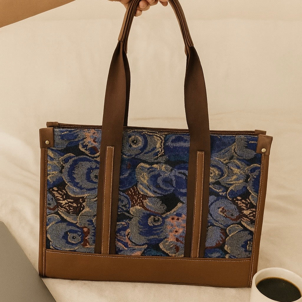 The Bloom Tote Bag is designed for effortless everyday use with a nature-inspired botanical weave and premium brown vegan-leather accents. It features a padded laptop sleeve that fits up to a 16-inch laptop, along with spacious room for all your work essentials. Comes with dual handles and a detachable broad shoulder belt for comfortable, versatile carry. Stylish, sturdy, and perfectly functional for work, travel, or daily routines.