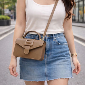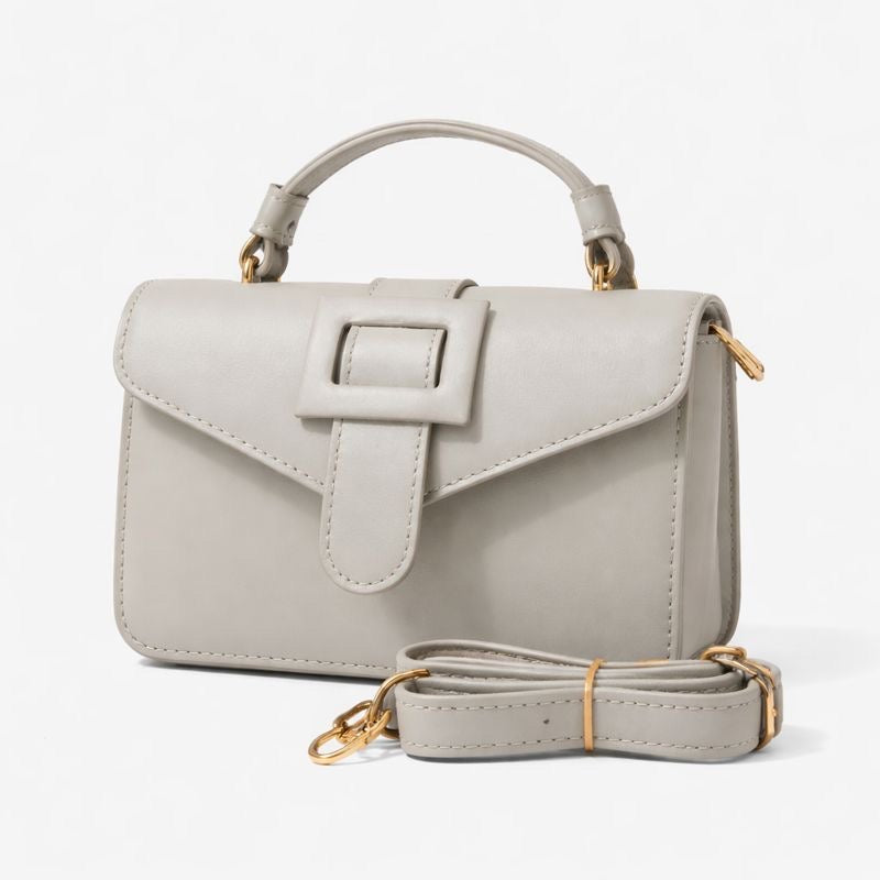 A refined mini handbag crafted with clean lines and a structured silhouette. Finished with a statement buckle, top handle, and detachable crossbody strap—perfect for effortless day-to-night styling.
