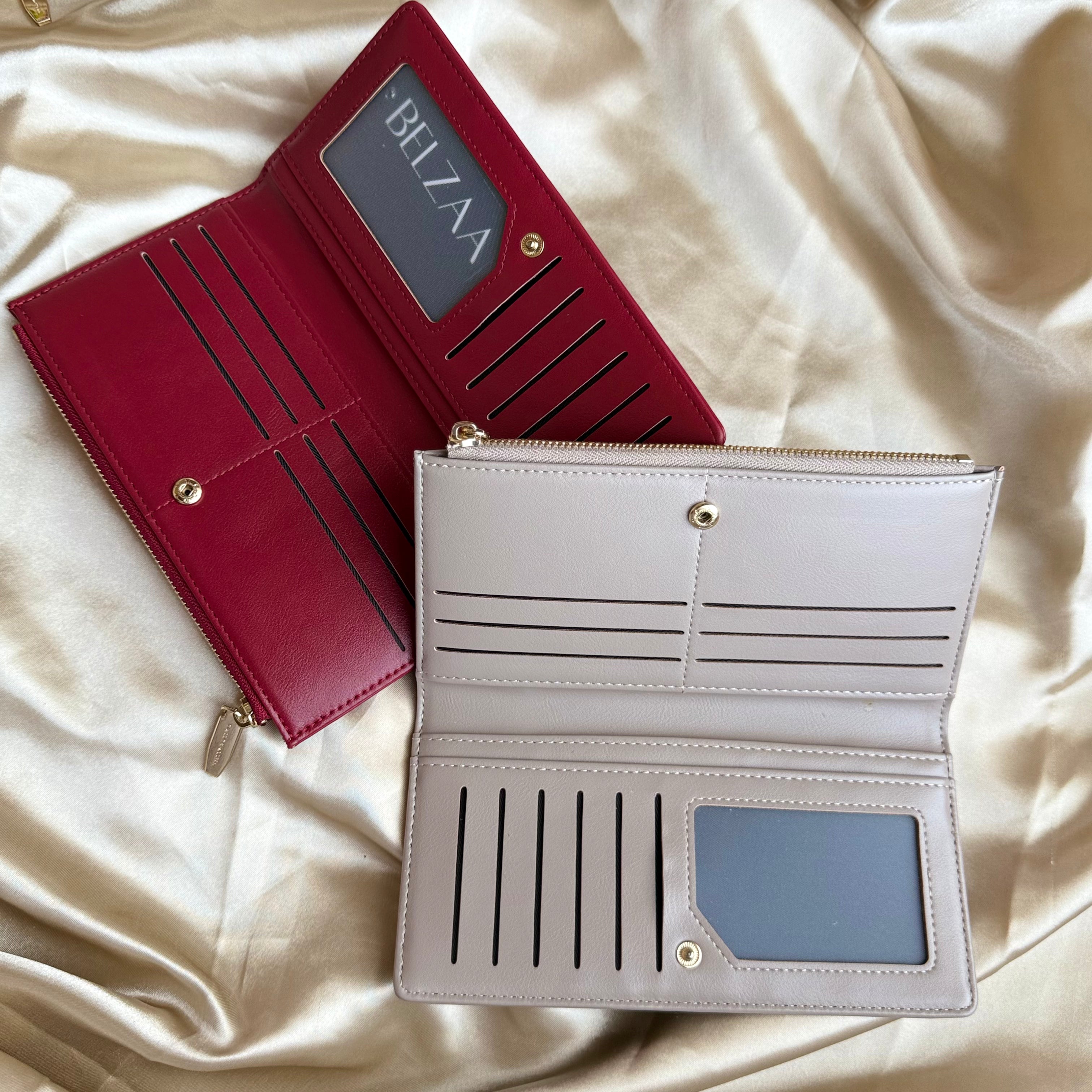 The two fold design offers excellent organization while keeping the wallet slim and easy to carry. Inside, you'll find multiple card slots, dedicated cash compartments, and a convenient ID window so everything stays neatly arranged and easy to access. The secure flap closure with a gold-tone accent adds a refined and sophisticated look.